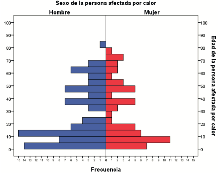 Los autores utilizaron una pirámide poblacional para presentar los datos de personas afectadas por calor en las "invasiones urbanas" estudiadas, la información se categorizó por sexo y grupo de edad. El código de R que aquí se presenta replica dicha gráfica. Los datos se rescataron usando la aplicación "WebPlotDigitizer" de Google Chrome, por lo que pudieran ser diferentes a los que utilizaron los autores.